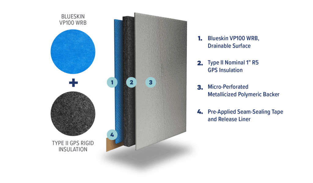 Featuring a lightweight 4’ x 8’ integrated panel that combines Henry’s Blueskin VP100 self-sealing and drainable weather-resistive barrier, Type II R5 graphite polystyrene (GPS) continuous insulation, and patent-pending vertical and horizontal seam-sealing overlays, each Blueskin VPTech panel fully seals against adjacent panels creating a uniform, continuous air barrier.