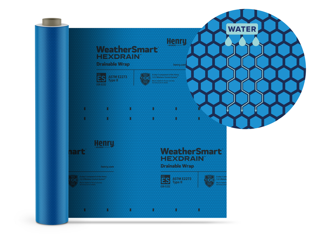WeatherSmart HexDrain is a new drainable housewrap with 3D hexagonal channels designed to direct water downward and out of the wall cavity quickly. This innovative design prevents moisture buildup, improving air circulation and reducing the risk of mold and rot. When used as part of the Henry® 1-2-3 Moisture Control System™ WeatherSmart HexDrain is backed by an industry-leading 15-year material PLUS labor warranty for product defects.